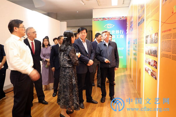 9月24日,“中国美术世界行暨海外研修工程成果汇报展”在京开幕。图为领导嘉宾参观展览。 中国文艺网 高森摄