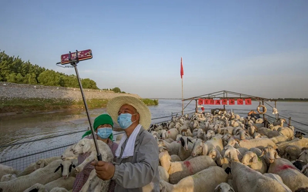 2020年5月10日,河南省原阳县官厂镇小庄村,村民王小俊夫妇牧羊归来,在黄河岸边的船上自拍。