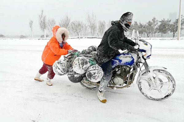 2021年1月7日,山东省威海市,一对夫妻冒着零下十几度的低温把养殖浮漂载回家。