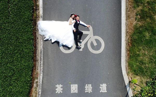 2019年10月22日,浙江省松阳县大木山茶园,一对新人在绿道上拍摄婚纱照。
