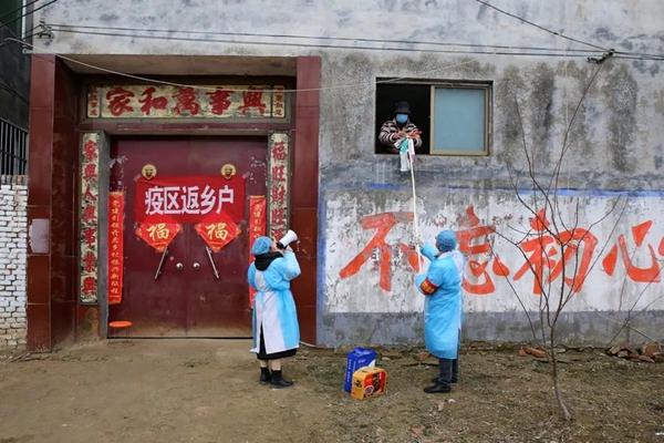 2020年2月2日,河南省夏邑县中峰乡朱双楼村,村卫生室医生和村干部为返乡隔离人员送去生活补给用品。