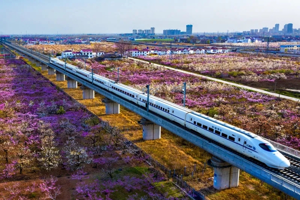 正值梨花桃花盛开季,一辆高铁列车穿越花海。