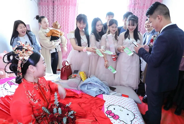 2020年11月11日,浙江省临海市沿江镇南将新村,一户人家正在迎亲,新郎用网络支付的方式发给伴娘团红包。