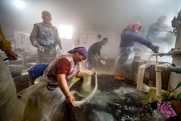 2018年3月9日,辽宁省葫芦岛市南票区,“粉丝小镇”高桥镇的村民正在加工粉丝。