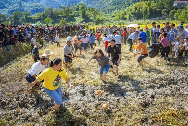 2020年10月10日,安徽省石台县,村民们正在进行趣味抓活禽比赛。