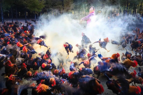 2019年10月3日,黑龙江省讷河市孔国乡德宝村,女场主张晓梅正在喂养“上树鸡”。