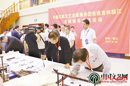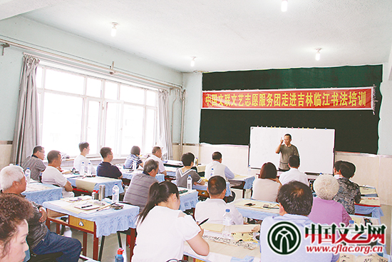 在短暂的行程中,文艺志愿服务团的艺术家王丹、叶培贵、陈辉、王伟平、梁达明、王小燕、景喜猷、孙维国抓住宝贵时间,与临江当地文艺工作者、书画爱好者一起举行书画辅导交流,开展了摄影、舞蹈、书法、美术等培训。