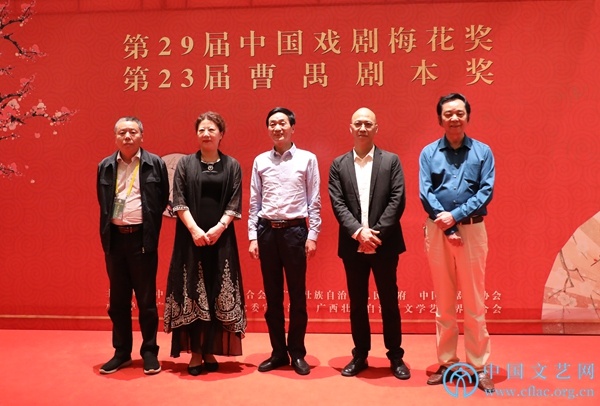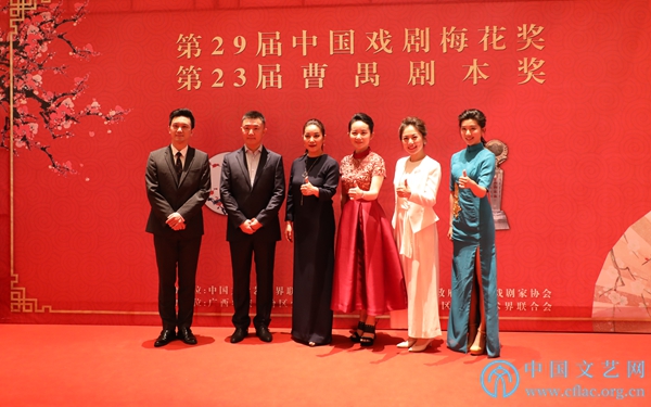 4月26日,第29届中国戏剧梅花奖和第23届曹禺剧本奖在广西南宁颁奖。图为荣获第23届曹禺剧本奖的编剧曹宪成、王羚、陈明、冯俐、步川(任永新)在红毯合影。中国文艺网 郝红霞 摄