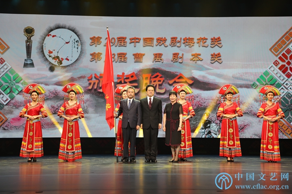 4月26日,第29届中国戏剧梅花奖和第23届曹禺剧本奖在广西南宁颁奖。图为江苏省南京市委常委、宣传部部长陈勇作为第30届中国戏剧梅花奖举办地代表,从中国戏剧家协会分党组书记、驻会副主席陈彦手中接过中国戏剧梅花奖旗帜。中国文艺网 郝红霞 摄