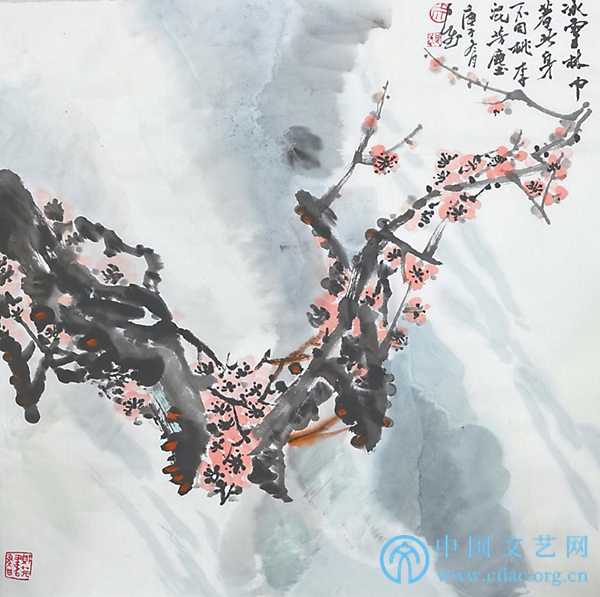 诚然,美术作品也讲究太极阴阳的哲学理念。无论是点、线、面的分割,还是刚柔并济的情境酝酿,都能异曲同工地展现中国画的自然美与生命力。刘良武有着温和的个性,做事不急不躁,他的安静祥和、儒派雅致在他的作品中得以传神点睛。从他的花鸟水墨画中可以嗅到他的气味与人生态度,既有传统老派的技法,又力求现代意象的光影柔和,在古典雅意之中追求现代气派,以画者之心创意山水,捕捉自然生发的细微,体味生命的奥义与生活之本真。可见画家的心境洞察以及审美立场的坚定。其实,在这条充满艰辛的艺术道路上,画家的坚守与探索同样重要。在当下的精神坚守与价值观念下,刘良武坚持真我的创作风格,踏实而坚定地行进在自我的艺术道路上,不媚俗、不慕奢华、不求功利。他淡泊朴实的人生态度在他的《清趣》《和平》《白雪红梅》等作品中流露无遗。